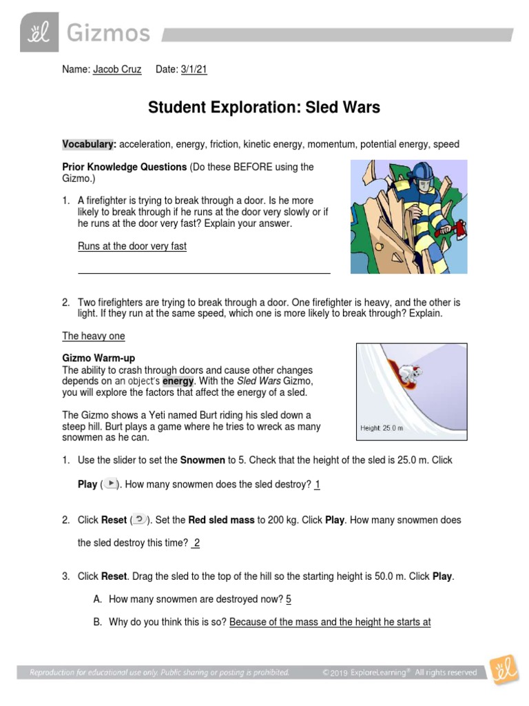 Some of the worksheets for this concept are student exploration phases of water answer key, explore learning student exploration air track answers, first grade guided reading levels e f g h i j. Gizmos as a student by leone izzo 1 year ago 4 minutes, 27 seconds 3 sled wars gizmo intro lt3 by tracie lentz 2 years ago 15 minutes 11,356 viewscalorimetry lab by carlos montero 4 months ago 7 minutes, 3 seconds. Show your work in the space to the right. The gizmo shows a yeti named burt riding his sled down a steep hill. Set the red sled mass to 150 kg and its height to 20 m. Check that show energyis on. With the sled wars gizmo, you will explore the factors that affect the energy of a sled. Set the blue sled mass to 100 kg and its height to 35 m. I would recommend actually doing the gizmo.i would, but i'm quite duuuuuuu.mm.bb.help. The impossible quiz space answers are the answers for the impossible game space. Sled wars gizmo answers key. To check your answer, set the height to 40 m and. Ready for student use exploration guide with answer key.